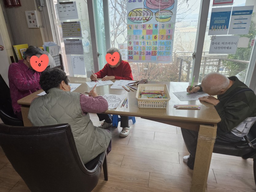똑같은 색깔을 사용하려다 다양한 색으로 유도하니 멋지게 완성하신 어르신, "모른다"고 하시면서도 마지막까지 서서 열심히 참여하신 어르신까지!