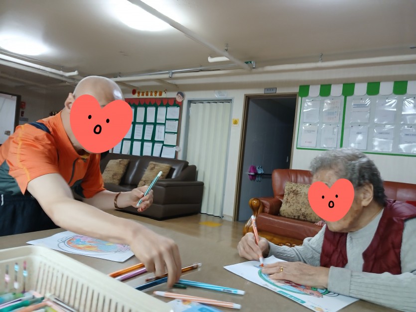이*순 어르신은 채색 순서를 세심하게 확인하신 뒤 평소처럼 색연필을 세워 꼼꼼하게 도안을 채우시며 옛 요리 실력을 뽐내듯 정성을 쏟으셨어요^^