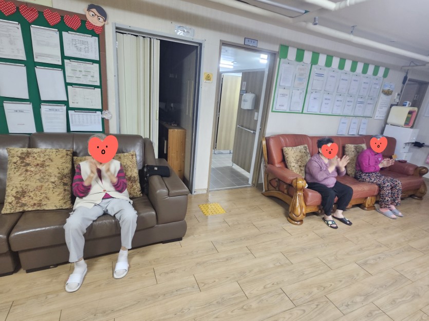 장*광 어르신은 구령을 정확하게 기억하셨고, 이*순 어르신은 소극적인 모습이었지만 허리를 세우시고 따라하셨습니다.