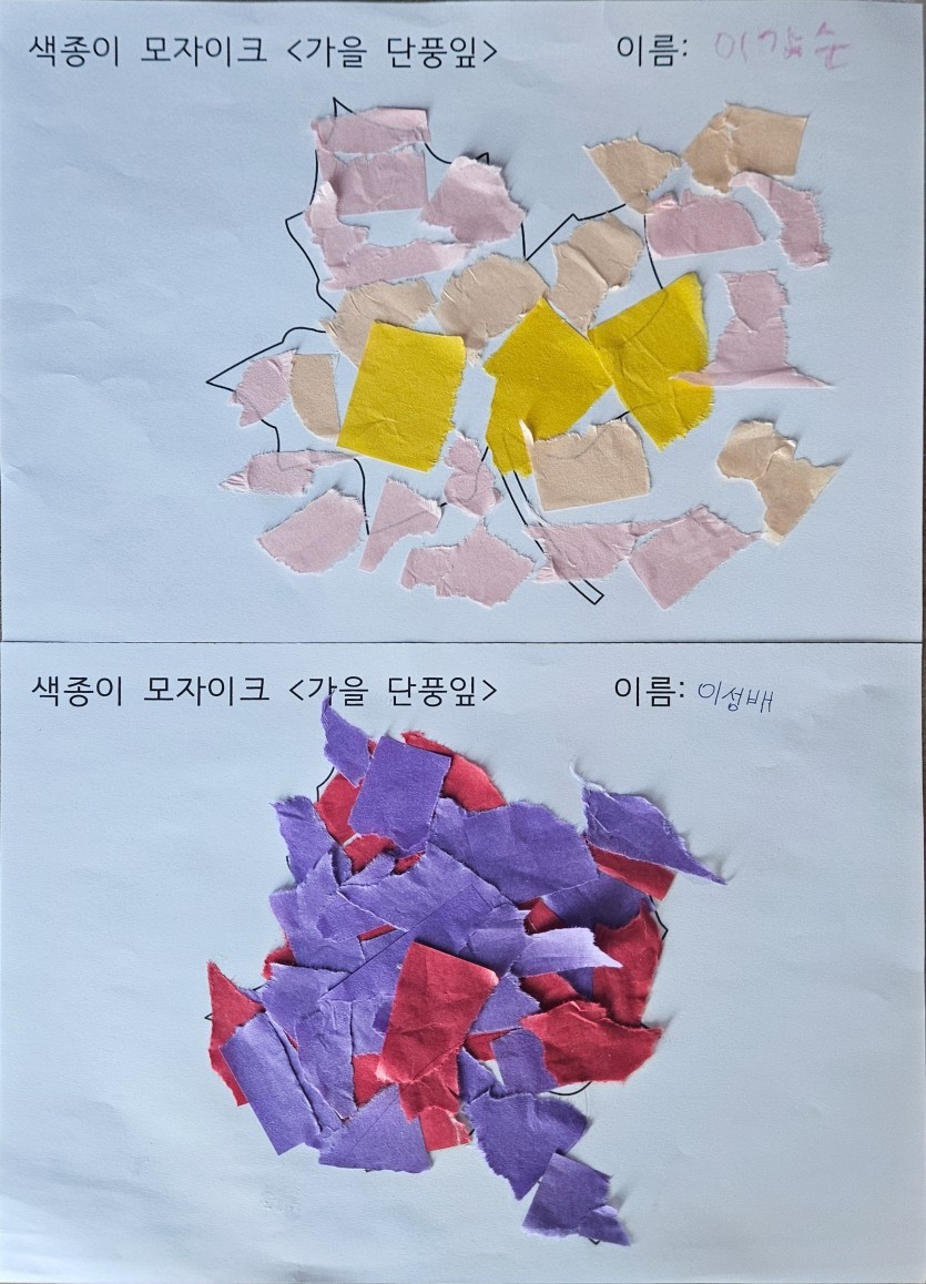 연한 풀칠에 잘 안 붙자 답답해하시면서도 손으로 꾸욱 눌러 끝까지 완성하시는 열정 덕분에 아름다운 가을 단풍이 완성되었어요.