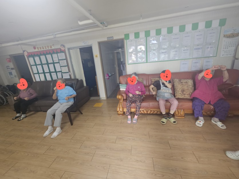 오늘도 어르신들의 몸과 마음을 건강하게 하는 체조 시간이 열렸습니다. 강*주 어르신은 박수를 힘차게 치셨고, 이*순 어르신은 처음의 부끄러움을 이겨내고 동작을 따라하는 열정을 보여주셨습니다.
